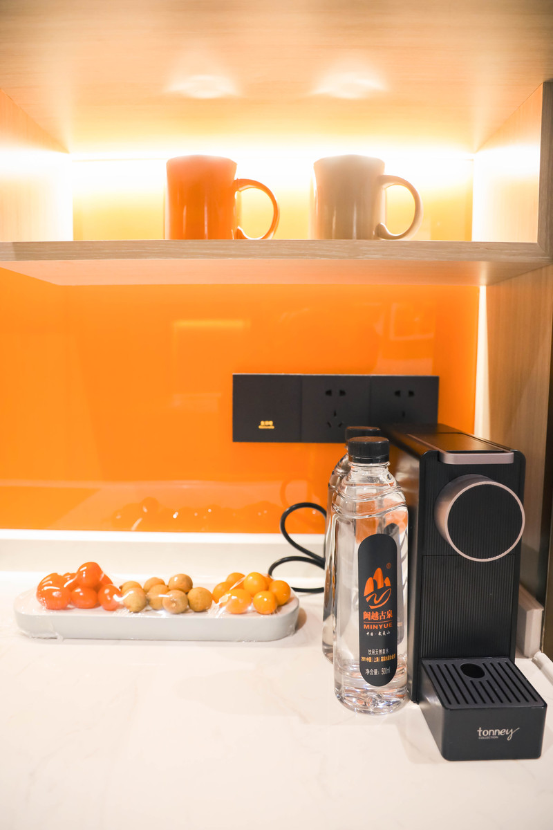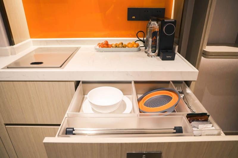 而厨台区的配置也相当完善、胶囊咖啡机、微波炉、冰箱以及隐藏式水槽,在桌面下方的抽屉里还有厨房用具,按压式开闭方法,打开简单,如果要在酒店多住几日,自己也能做点吃的。