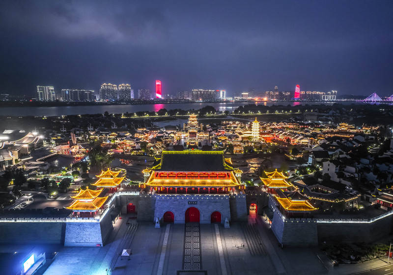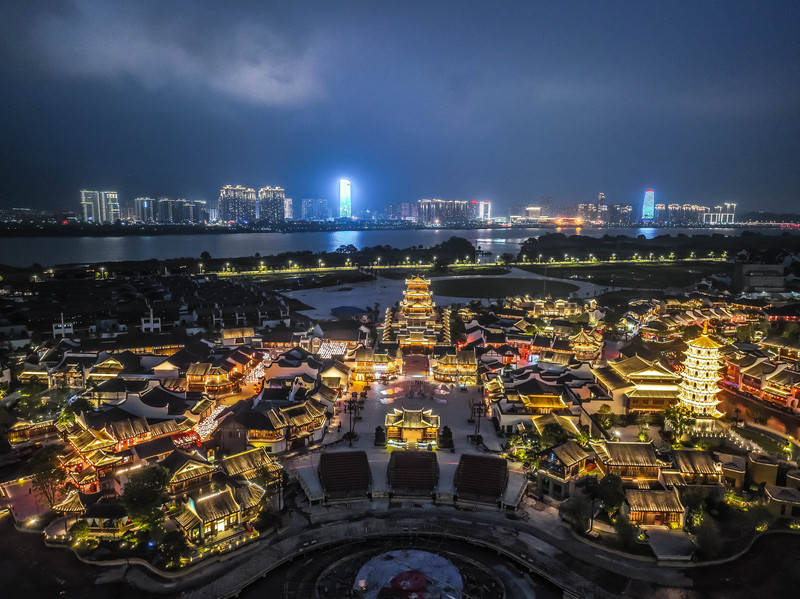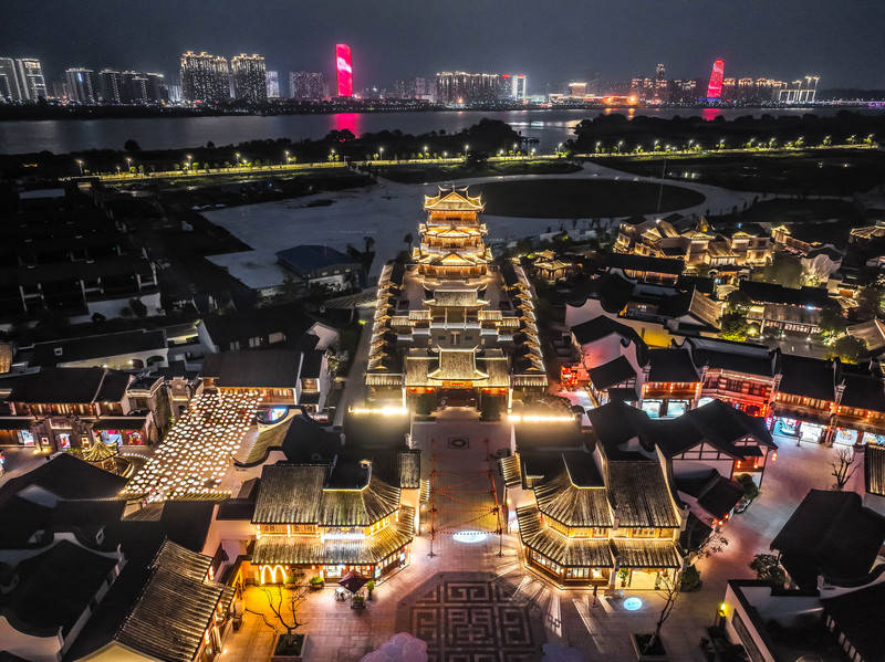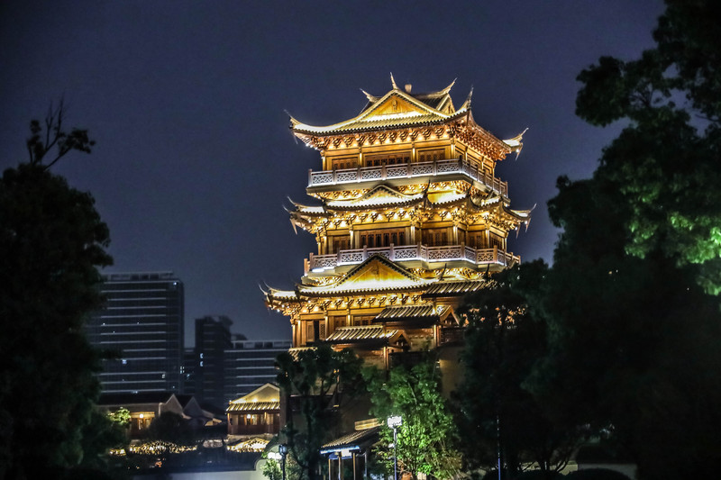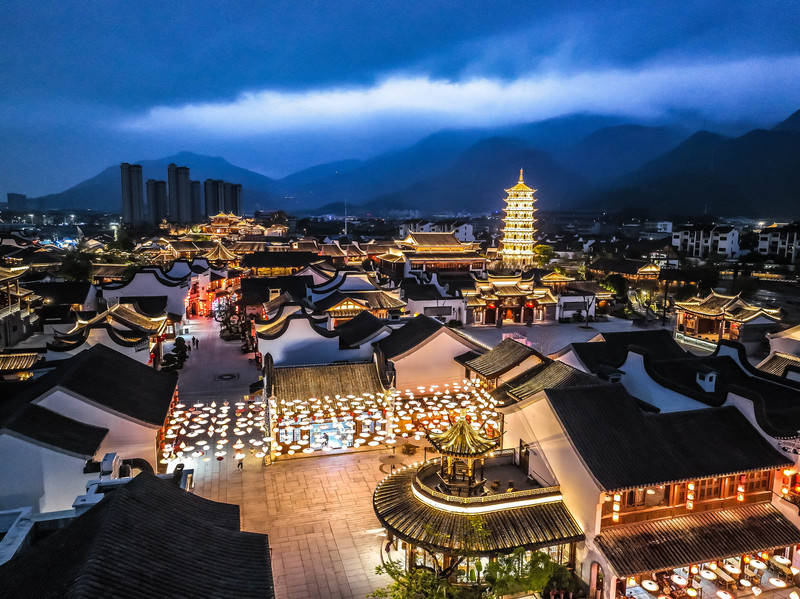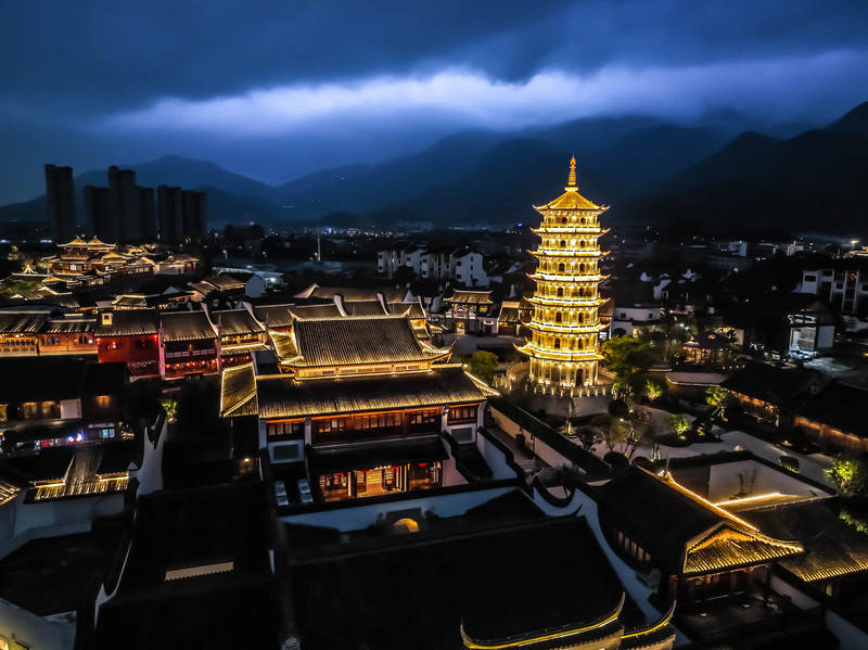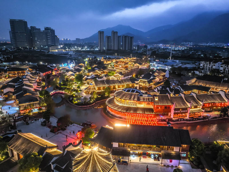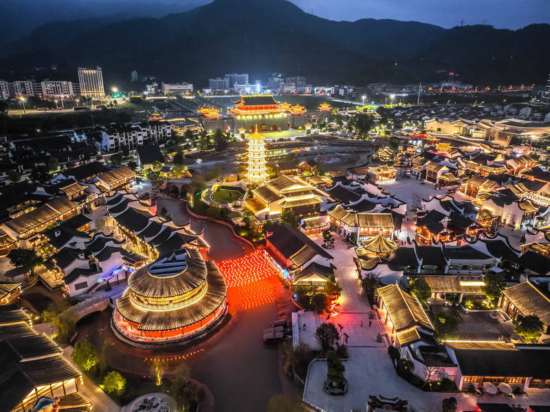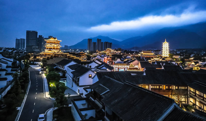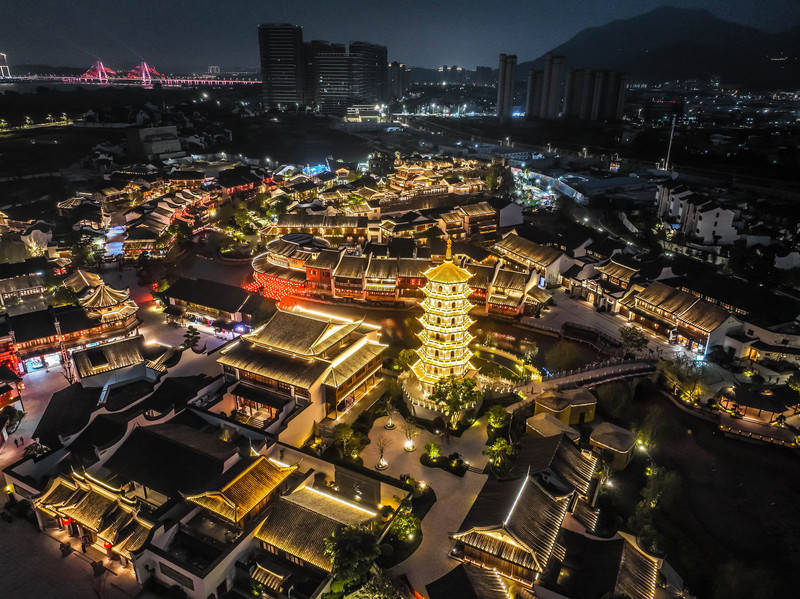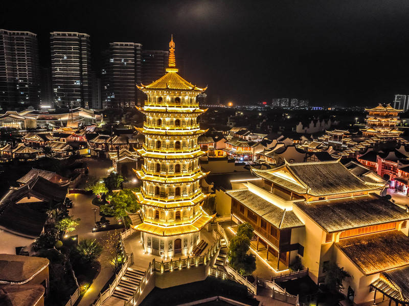 入夜之后的闽越水镇,灯火通明,流光四溢,整个景区如同天上的街区,灯光的衬托之下,夜色也变得温柔起来了。高耸挺拔的延福塔披上了一层亮眼的外衣,在黑夜之中熠熠生辉。