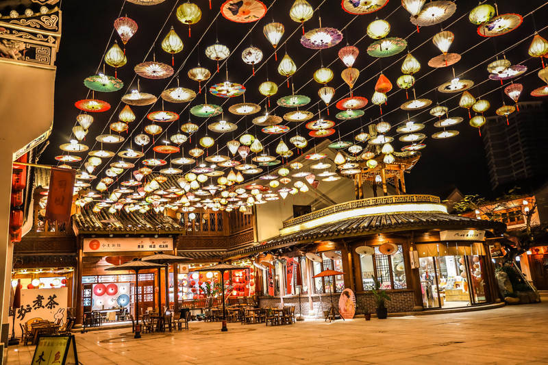 这里的街道是漂亮的,店里面是热闹的现代生活,店外面是悠悠的水乡风采。一个个彩灯串出了一条独特的花路,各种图案的油纸伞成了此刻最好的装饰,夜空因此变得绚烂,水镇也愈发温柔了。