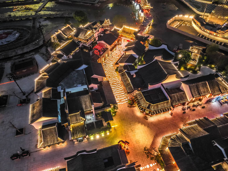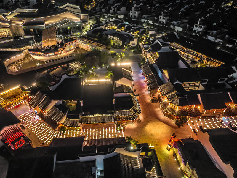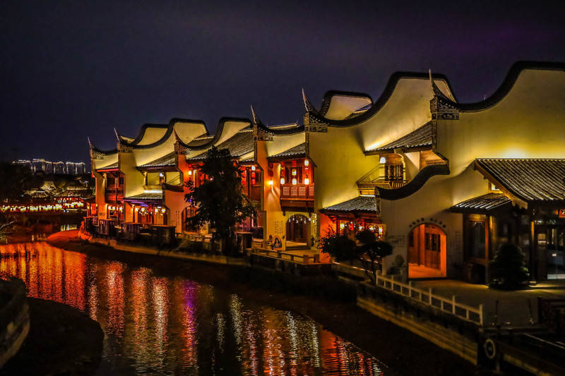 各种形状的灯笼在黑夜里绽放着光彩,古色古香的游船在盈盈的水面上,泛着微微的光,水乡的温婉呼之欲出。