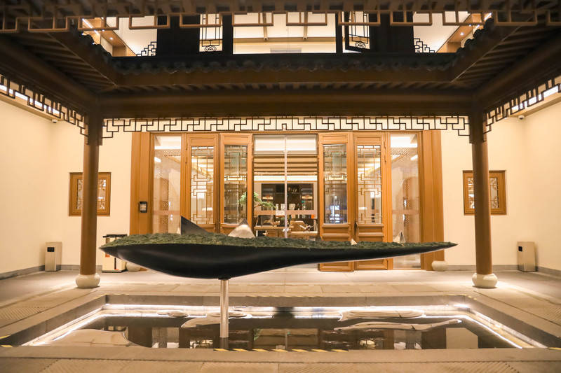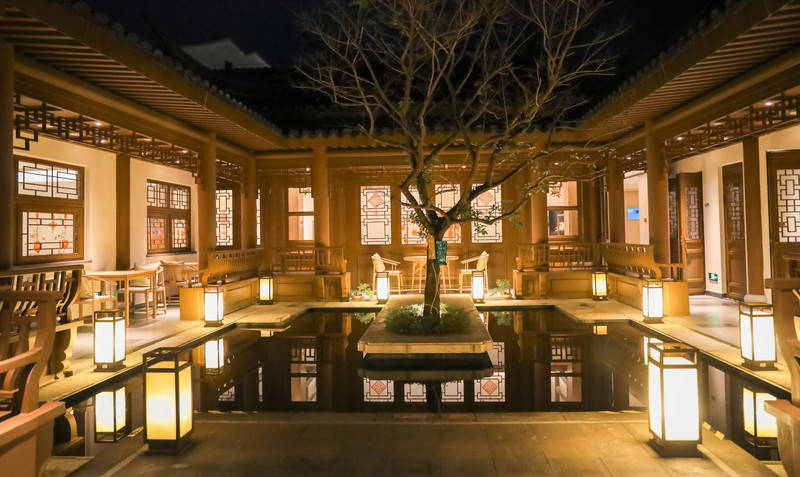 船承精品酒店临湖而建,外形是船屋形状,闽都官式建筑风格,在晚上点灯之后特别漂亮,而且内部还有中式园林庭院,更显得优雅十足。