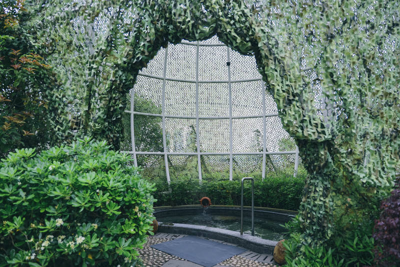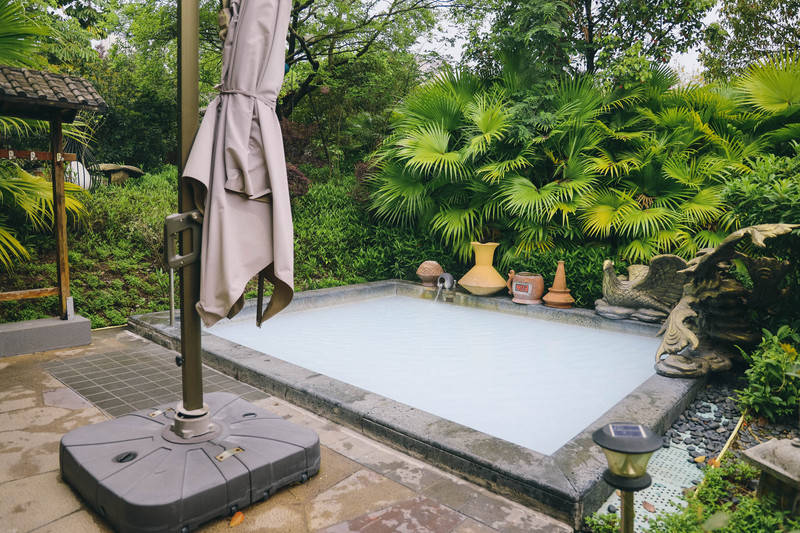 位于山顶的椭圆形泡池非常受客人欢迎,造型独特,而且私密性更好。度假区还很贴心地在沿路提供了免费茶水,既不打扰客人放松泡汤,又可以让客人及时地补充水分。