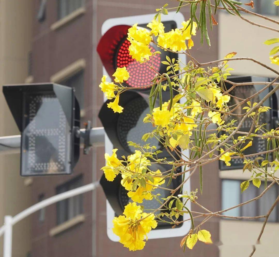 “一树黄花传妙韵,风铃清脆伴云飞。”洪州大道黄花风铃木盛放,明黄色的风铃花在暖阳下金光闪闪,迎风摇曳,串成一条条“黄金带”,灿烂夺目。