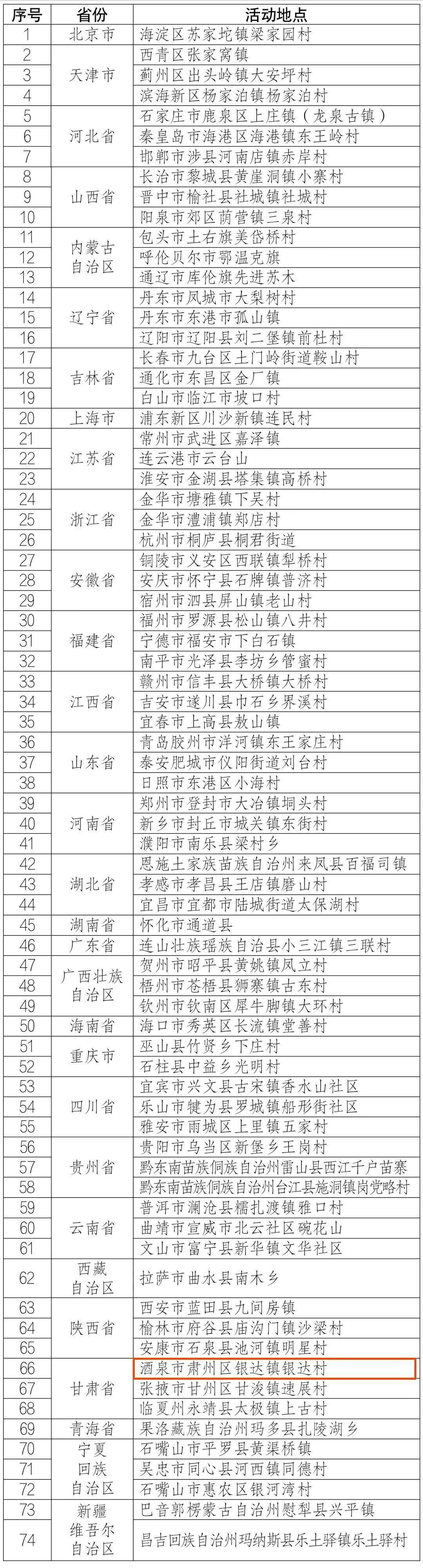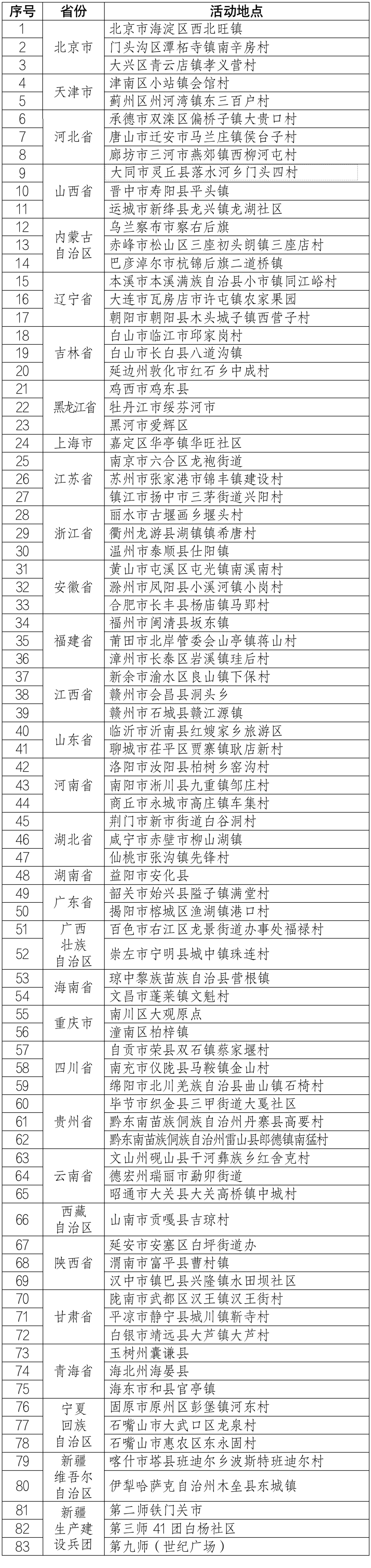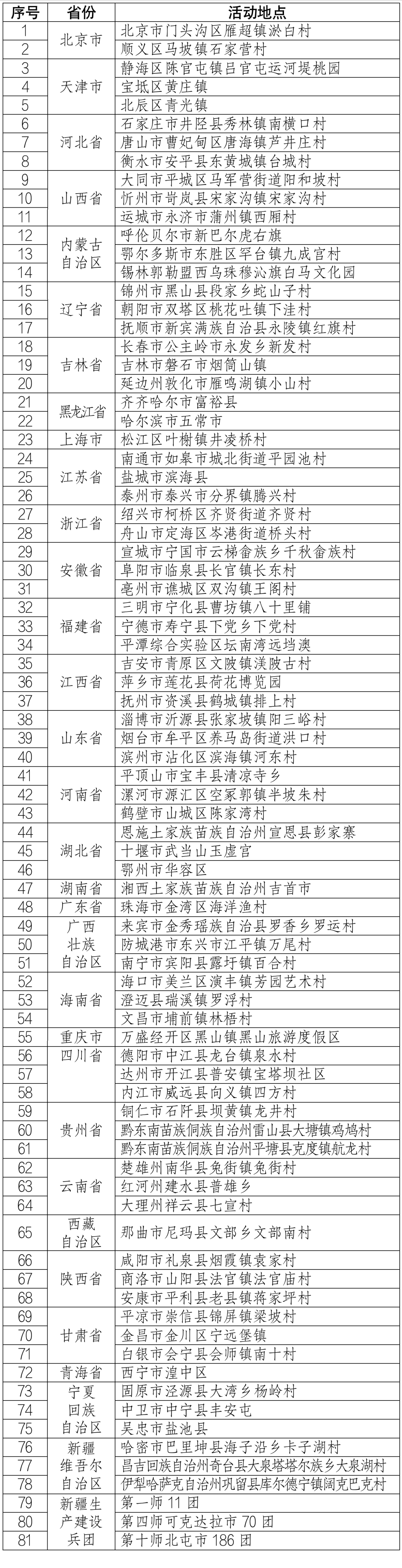 根据《文化和旅游部办公厅关于开展“四季村晚”活动的通知》要求,文化和旅游部公共服务司在各省级文化和旅游行政部门申报推荐的基础上,经研究,确定春季“村晚”主会场设在四川省宜宾市、夏季“村晚”主会场设在云南省丽江市、秋季“村晚”主会场设在江西省九江市、冬季“村晚”主会场设在浙江省丽水市、广西壮族自治区柳州市,并确定了“四季村晚”示范展示点名单,现予以公布。
