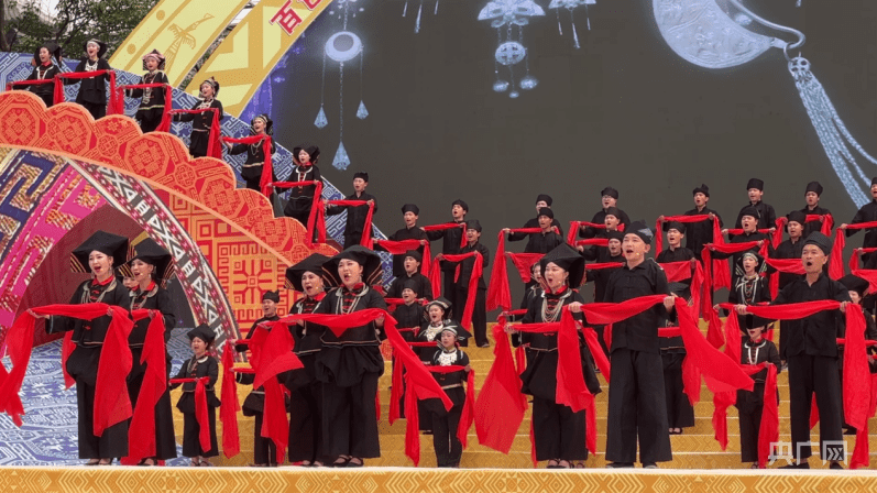 在启动仪式文艺演出中,极具民族特色的歌舞轮番上演,将“壮族三月三”的喜庆氛围推向高潮。在《一路唱歌一路来》节目中,歌手们身穿黑色壮族服饰,手拿红色“盘梁”,用那坡县壮族特有的“过山腔”唱法唱出了在党的领导下各族人民生活越来越好的喜悦之情。“看到这么美的壮族服饰,听到这么美的壮族山歌,真的不虚此行,‘三月三’来广西就对了。”深圳游客黎女士说。