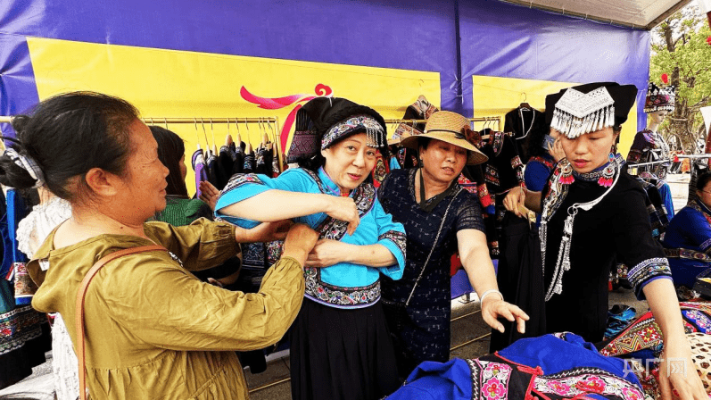 游客试穿壮族服饰(央广网记者 黄月芬 摄)