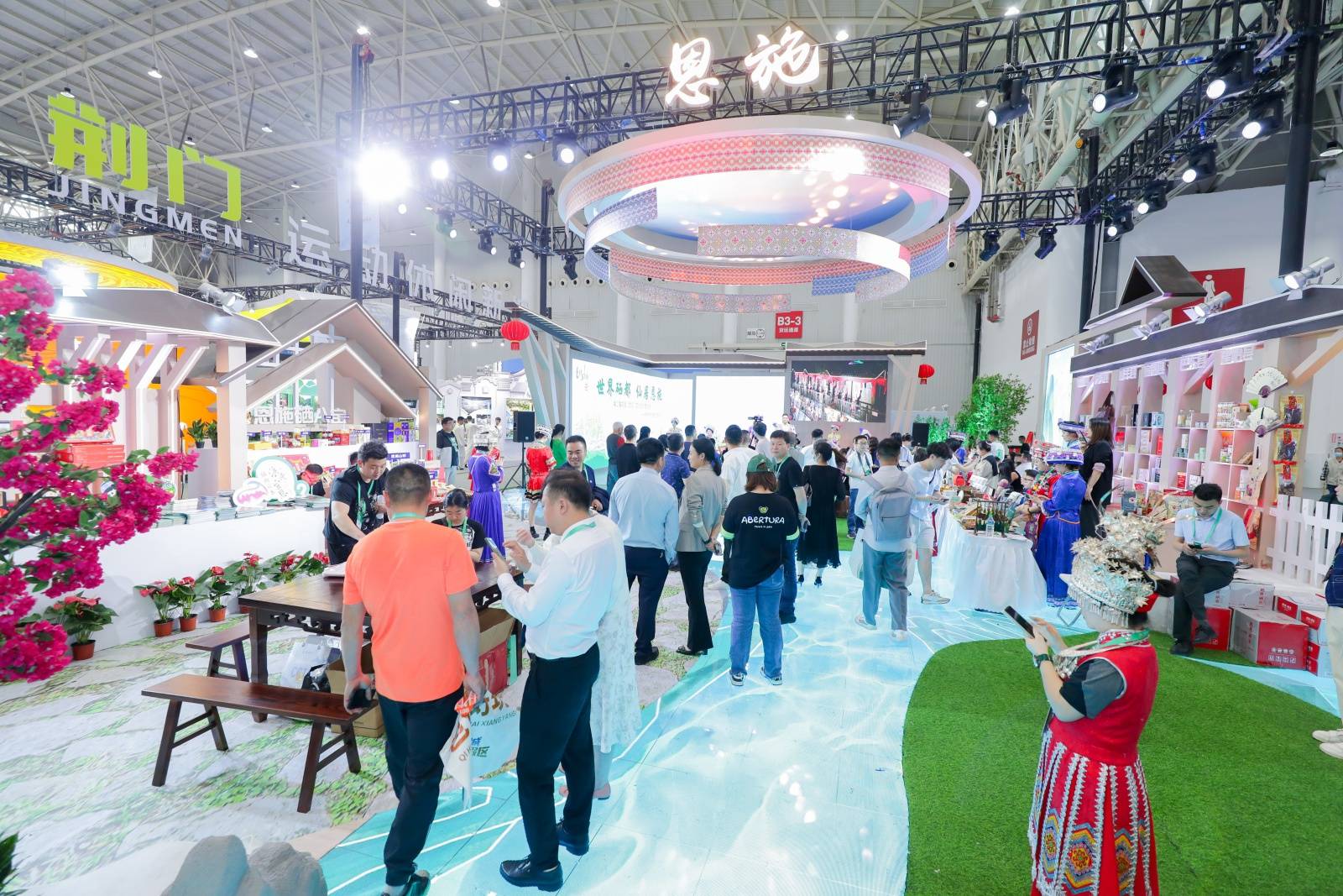据恩施市文旅局局长李国玲介绍,恩施馆以“山水之恋、人文原乡、秘境相逢、远方家园”为篇章,参展内容涵盖恩施文创产品、恩施玉露、富硒农产品、土特产、旅游商品、非遗项目草编等各大门类,分别通过展示区、售卖区、表演区等区域进行宣传展示。有近20家恩施企业、70余人参加了此次恩施展馆的筹备。