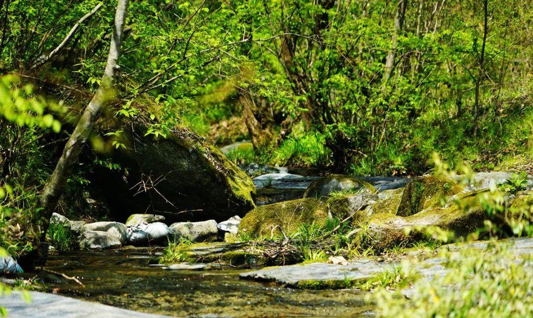 沿步行小道一路前行,四处绿树丛荫,溪水潺潺,斑驳的阳光透过树梢,折射在山涧树林,伴随着鸟鸣蛙叫,神秘由此诞生。