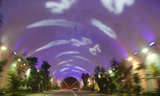最后,开车经过这条隧道的时候,里面是很好看的,有蓝色、红色和白色三种荧光灯带,宛如自己穿越到了一个什么地方旅游一样,但大家也不要看着看着忘了自己是司机,那可是要出大事的。当然了,这这条方便了大家的隧道,还是要感谢那些挖隧道的人,没有你们,我们还在开三个小时的盘山公路呢!