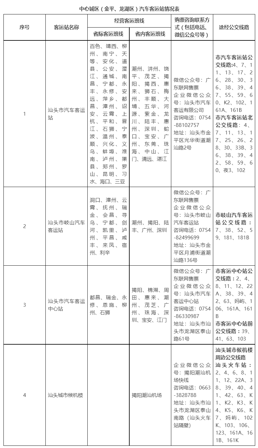 中旅客运站停止营业后,周边有出行需求的市民可选择到 汕头市汽车客运站、汕头市岐山汽车客运站、汕头市汽车客运中心站、汕头城市候机楼乘车,实时班时信息请关注“广东联网售票”、企业微信公众号查询或电话咨询,具体发班班线、联系方式、途经公交线路等信息详见下表。