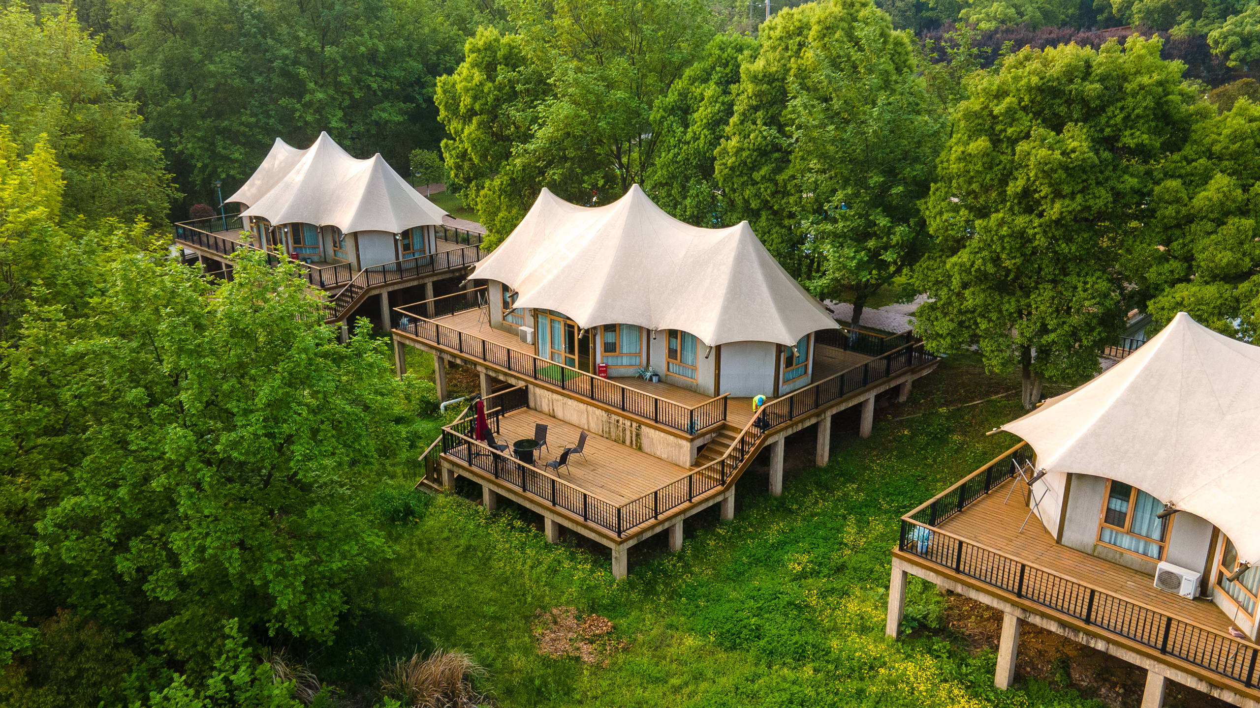 临水处有4座亲水野奢帐篷,一顶顶帐篷,创造了一个个浪漫的空间。在落日余晖时,凭栏眺望,在星空下遥望星空,露营中的自己其实是一场与自然万物对话的过程,没有城市的喧嚣,没有灯红酒绿,这种感觉让人很是享受。