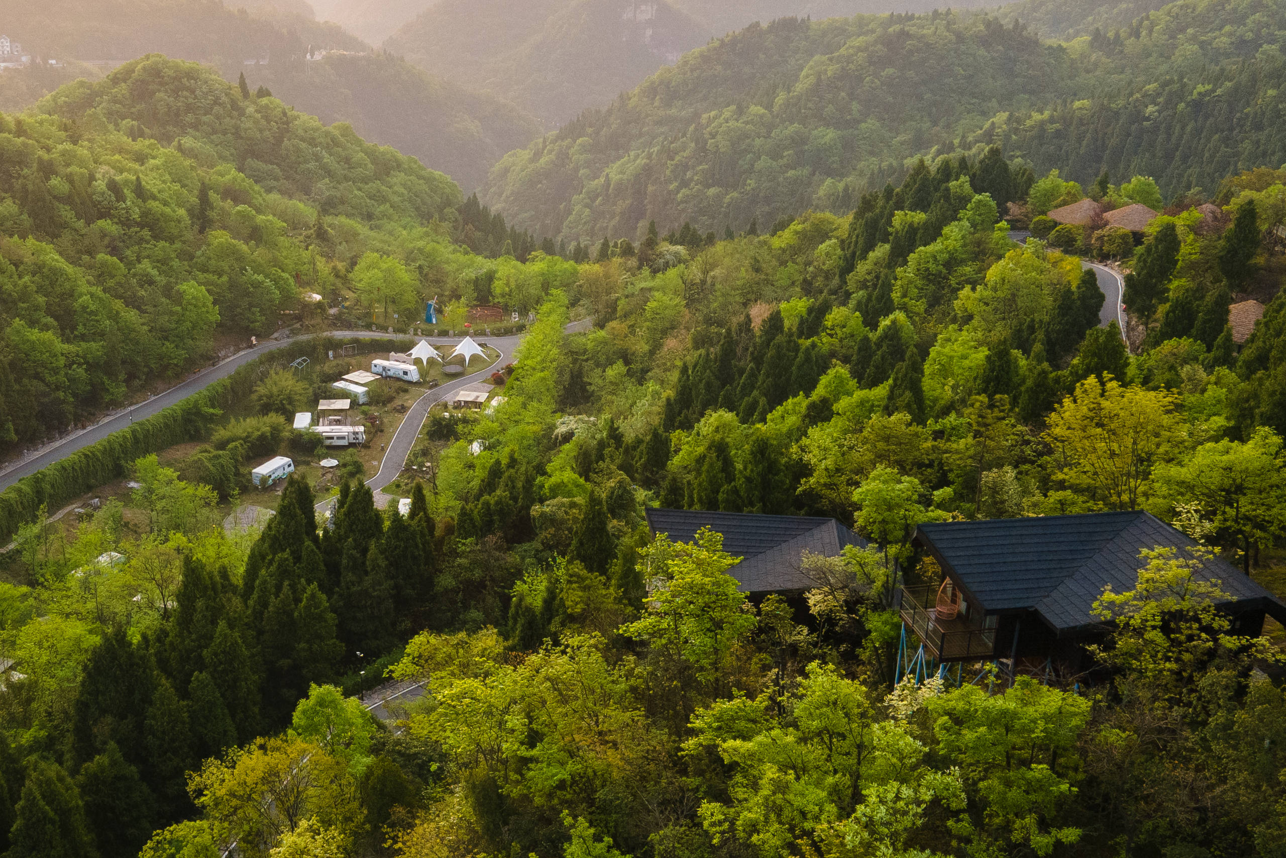 之前也曾住过房车营地,但像三峡国际房车露营地环境这般好的真不多见,这里的森林植被覆盖率极高,一座座小木屋或帐篷酒店隐于山林间,与周边环境毫无违和感。