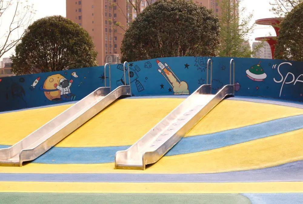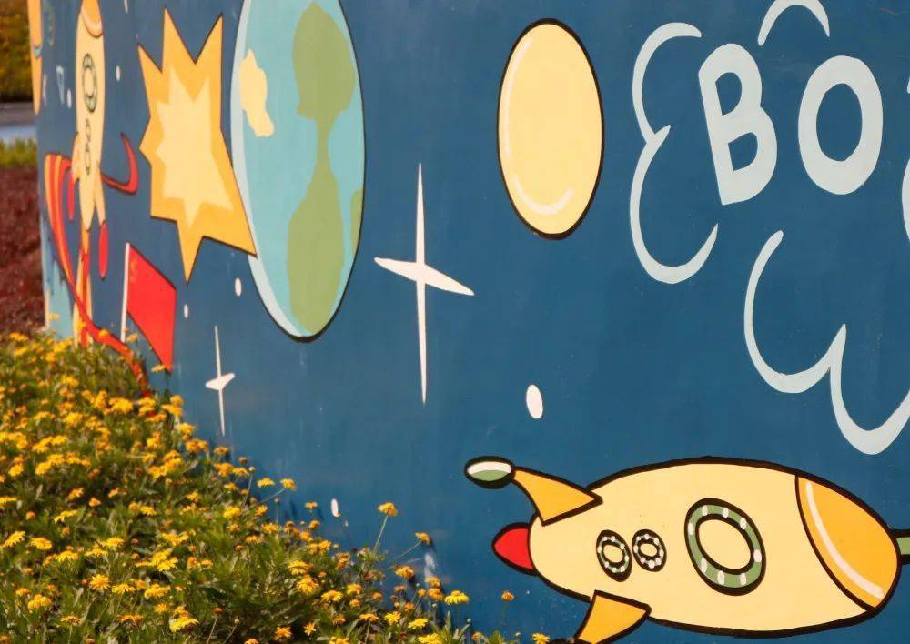 飞船、火箭、地球……极具色彩张力的卡通图案在园区尤为引人注目。手绘的墙面让儿童乐园充满了童趣,让墙面与游乐设施相得益彰。
