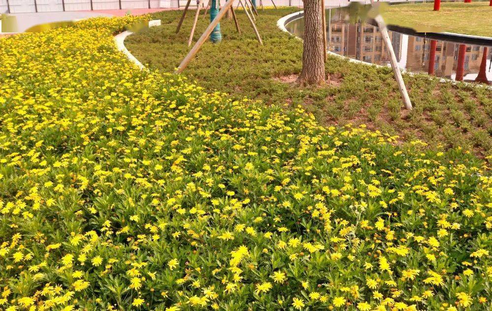 走进A区,前广场水晶花园被满地的绿植花卉围绕着,映入眼帘的黄色小花开得格外灿烂。水晶花园的下沉式绿地景观让公园应对雨水来袭毫无压力,雨水通过下凹的坡形地面渗入土壤,涵养地下水,让城市的“呼吸吐纳”更为自如。