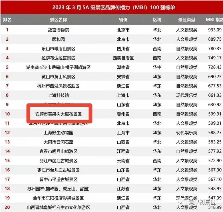 以下是迈点研究院独家发布“2023年3月5A级景区品牌传播力(MBI)100强榜单”。