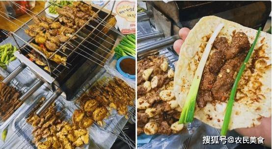 这里的烧烤还会有特制的小饼和葱,蘸好了各种小料的小饼,里面夹上新鲜的大葱和烤好的肉,味道别提有多好吃了。几个小伙子也是越吃越喜欢,又让老板加了不少的菜才吃尽心。