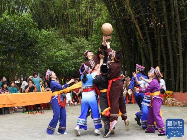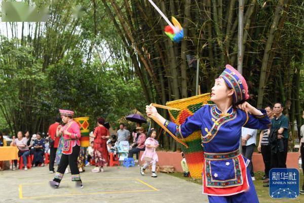 ↑4月21日,在罗城县米椎林景区,人们参加仫佬竹球比赛。