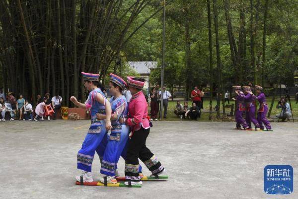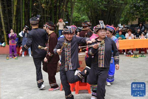↑4月21日,在罗城县米椎林景区,人们参加板鞋竞技比赛。