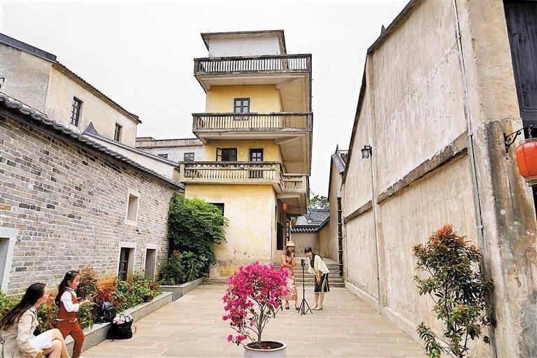 到了周末,观澜古墟人流如织,不少游客拍照打卡。转过墙角,零星的鼓声传来,游客们等待着乐队表演。一组粉色的架子鼓摆在坡顶单层民国古建筑门廊下,高高的门洞上方有两扇窄窗,左侧门洞上方写着“宝安县利源侨批局”。与之相对的是写着“人民邮电”的二层碉楼。一瞬间,人声鼎沸采购洋货的繁荣市集场景穿越百年,与眼前的游客们重叠。