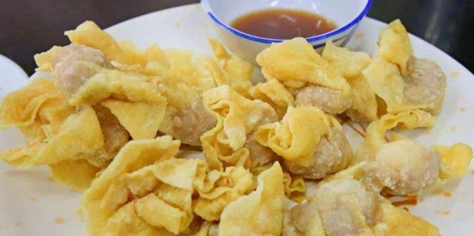 云吞又称扁食,是广东广西地区特色传统小吃,属粤菜系;云吞外皮以及里头的馅料都跟馄饨不同,大小一般以“一口吞”为标准;按照老广记的标准,一碗标准碗云吞数量为6颗到8颗。