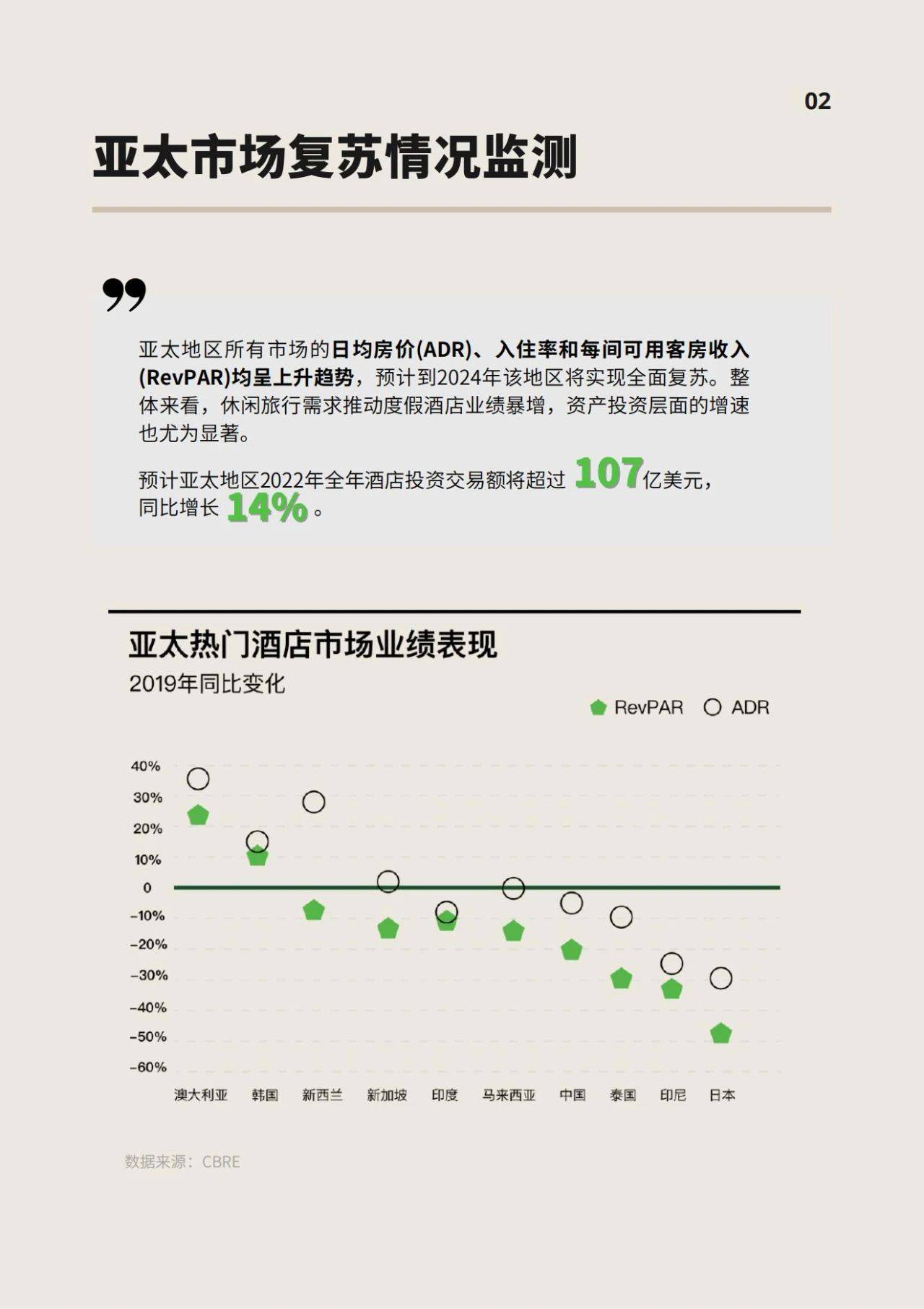 预计亚太地区2022年全年酒店投资交易额将超过107 亿美元,同比增长14%。