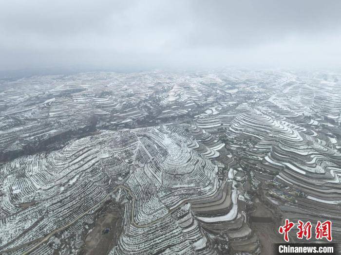 4月21日,甘肃省定西市安定区降雪。雪后的黄土塬白雪皑皑银装素裹,航拍白雪覆盖下的黄土高原梯田层叠,十分壮美。