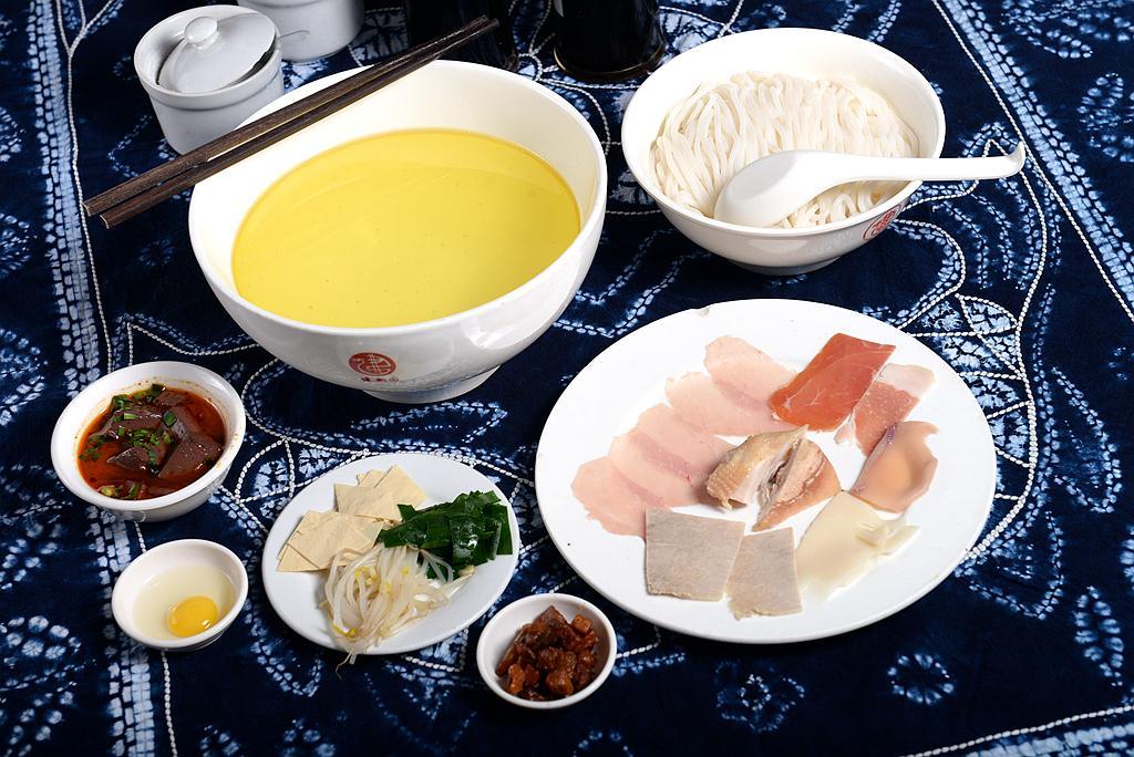 二是汤好。过桥米线汤是用猪大骨头、老母鸡、云南宣威火腿经长时间熬煮而成的,汤好,可以征服挑剔的食客。用鹅油封住汤的表面,汤汁虽然滚烫,但不冒热气,看上去极为“冷静”;