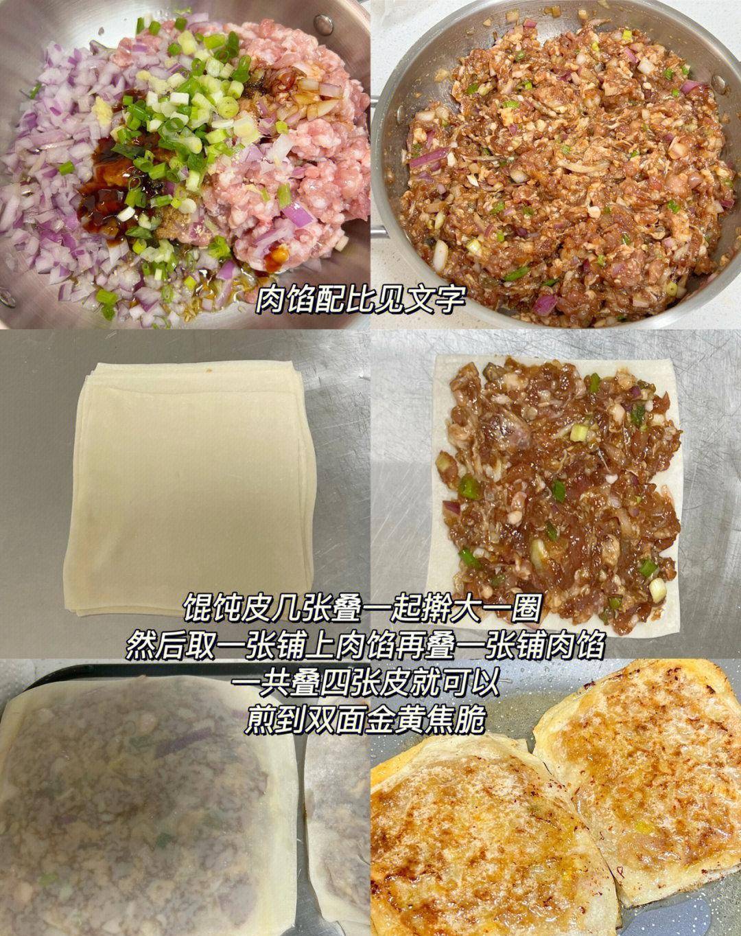 制作千层馅饼的方法也非常简单。只需要将馄饨皮叠放起来,铺上肉馅,再将另一张馄饨皮叠放上去,重复这个过程,直到叠好四层馄饨皮为止。然后,将叠好的馅饼煎至双面金黄焦脆即可。这道美食不仅肉馅多汁、口感十足,而且皮薄馅大,十分可口。