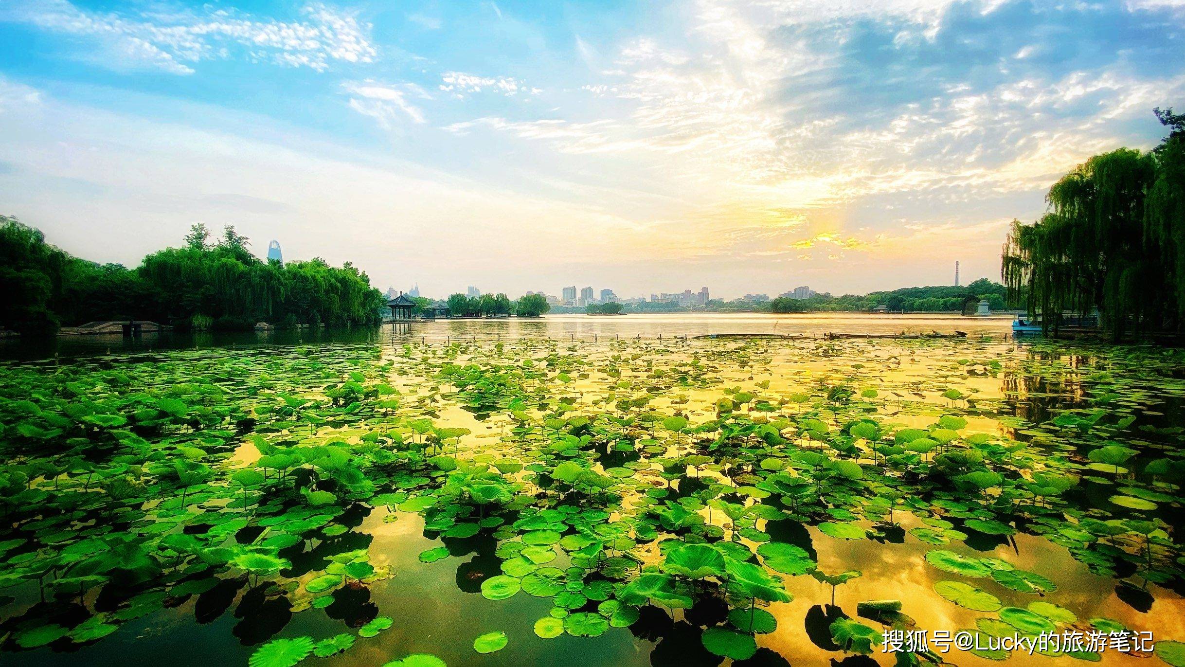 大明湖,是济南市区内的一处天然湖泊,也是济南著名的旅游景点。这里湖光山色、景色宜人,游人络绎不绝,是赏花、游湖、垂钓、散步的好去处。湖中还有两座岛屿,北岛上有“母子相依”石刻,南岛上有钟楼、鼓楼等古建筑。