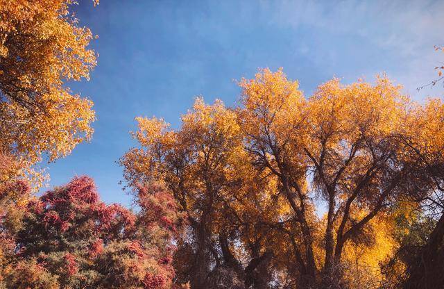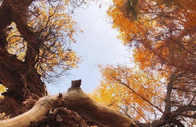 我们一路要来新疆看胡杨,以天山山脉为界线,南北疆都有胡杨林,北疆的木垒县和伊吾县的胡杨较为出名,南疆则分布比较广,在塔里木河流域,以及孔雀河流域,几乎都有大面积的胡杨林,因为季节气候的原因,我们要看金秋胡杨美景,南疆相比北疆,胡杨叶落的要稍微晚一些。运气不错,这次刚好赶上南疆胡杨最美秋景。(图片摄影:行野)