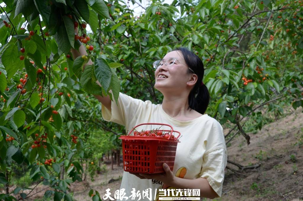 樱桃园里,游客们一边采摘品尝可口的樱桃,享受着樱桃从树上到嘴上“最短距离”的快乐,一边将精心挑选的樱桃放进篮子里,带回去给亲朋好友品尝,还有的游客拿起手机和樱桃合影、拍视频,玩得不亦乐乎。