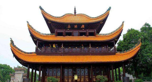 岳阳楼的外部构造古朴独特,楼内的台阶大多采用花岗岩所建,楼部上方仿佛三艘大小不一的船,重叠而上,从哪个角度看,都是一副屋檐翘角的模样,整座岳阳楼没有使用一铆一钉,全部都采用了木质的材料,互相勾连而成。