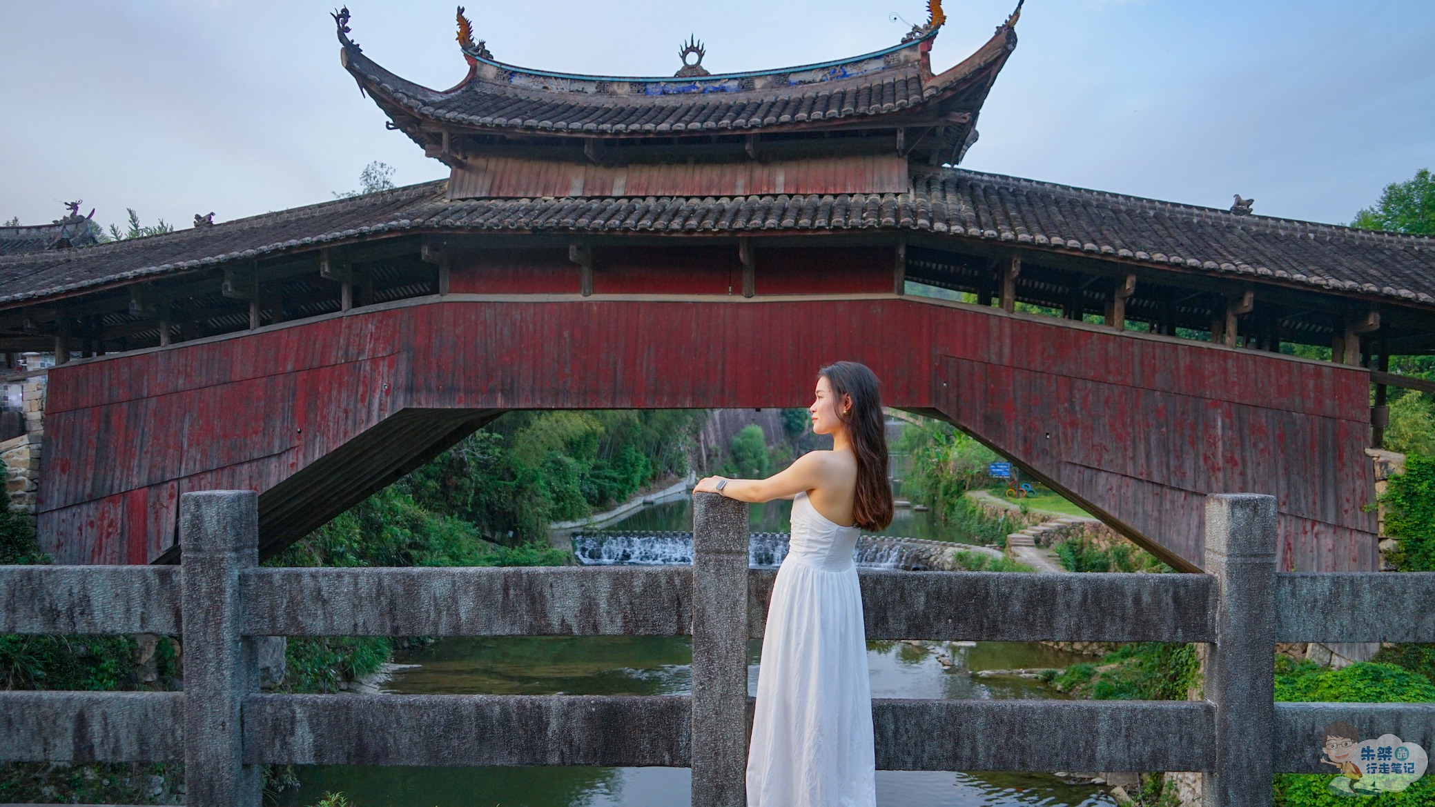 与北涧桥仅数百米之隔的溪东桥,被誉为是北涧桥的“姊妹桥”,且由于相较下桥地势略高,当地人又常称其为“上桥”。它坐落于泗溪镇白粉墙村,因横跨东溪而得名,虽与北涧桥一样系叠梁式木拱廊桥结构,但整桥外型则更为美观,被誉为是泰顺造型最佳的木拱廊桥。溪东桥始建于明隆庆年间,清乾隆、道光年间皆有重建,独特的造型,优美的线条,加之宫殿式的重檐阁楼,以及高高翘起的飞角,给人以腾空欲飞之感,雄伟且壮观。
