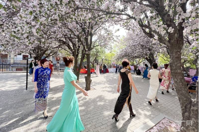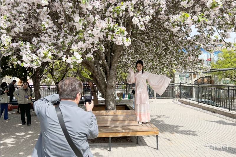 着旗袍、汉服在花间留影(央广网记者 王松 摄)