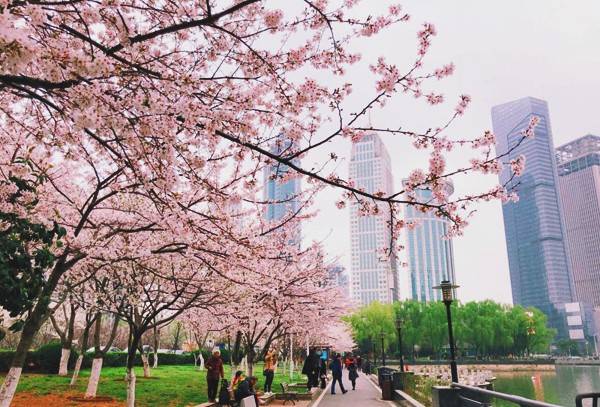 上图:武汉汉口闹市中心西北湖畔的街头樱花怒放,春意弥漫全城。