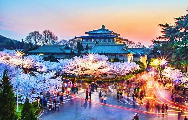 上图:被誉为中国最美大学校园之一的武汉大学内游客夜赏樱花的美景。