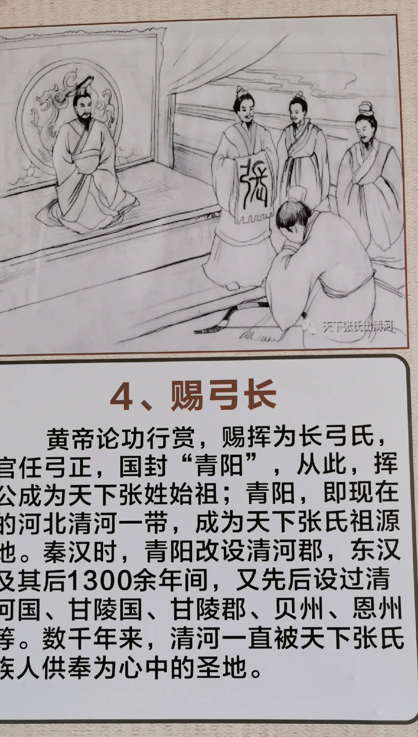 张姓始祖张挥,号天禄,青阳之子,是古代重要武器弓矢的发明者。因弓箭的诞生对社会影响大,所以黄帝封挥为弓正,职掌弓矢制造。后又取弓长之意,赐姓张于濮阳,封地清河。后逝葬于帝丘(今河南省濮阳县)。因此,张挥成了张姓人的始祖。
