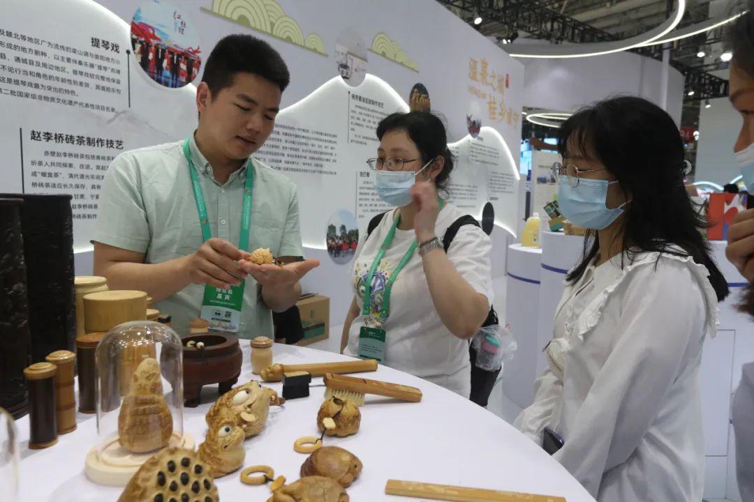 “哇!好香啊!”不少观众循着桂花香走进咸宁展区,展区内充满温泉、楠竹、桂花、青砖茶等元素,仿佛身处自然生态公园。
