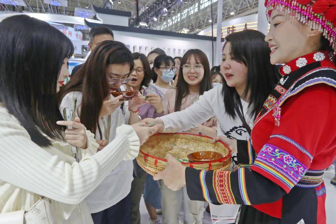 “这是咸宁的青砖茶,口感香醇,很好喝,也很解腻。”工作人员向观众们边倒茶边介绍青砖茶。