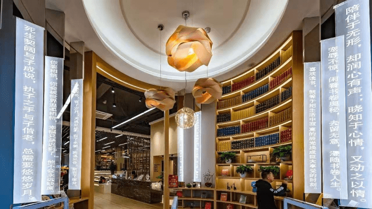 进入书店,映入眼帘的是一通高的圆形大厅,有诗题于堂,素色灯光,顶面如同有花盛放其间。