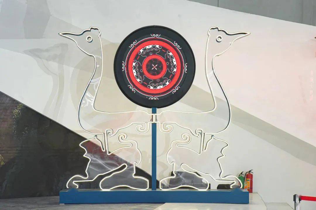 展馆入口处,融合湖北科技特色“光芯屏端网”的艺术装置虎座鸟架鼓,使用了湖北光谷研发生产的1.8小间距圆形LED显示屏。整体外圈的造型采用光的语言符号再创造,融合科技、艺术、文化的创新形式表达。