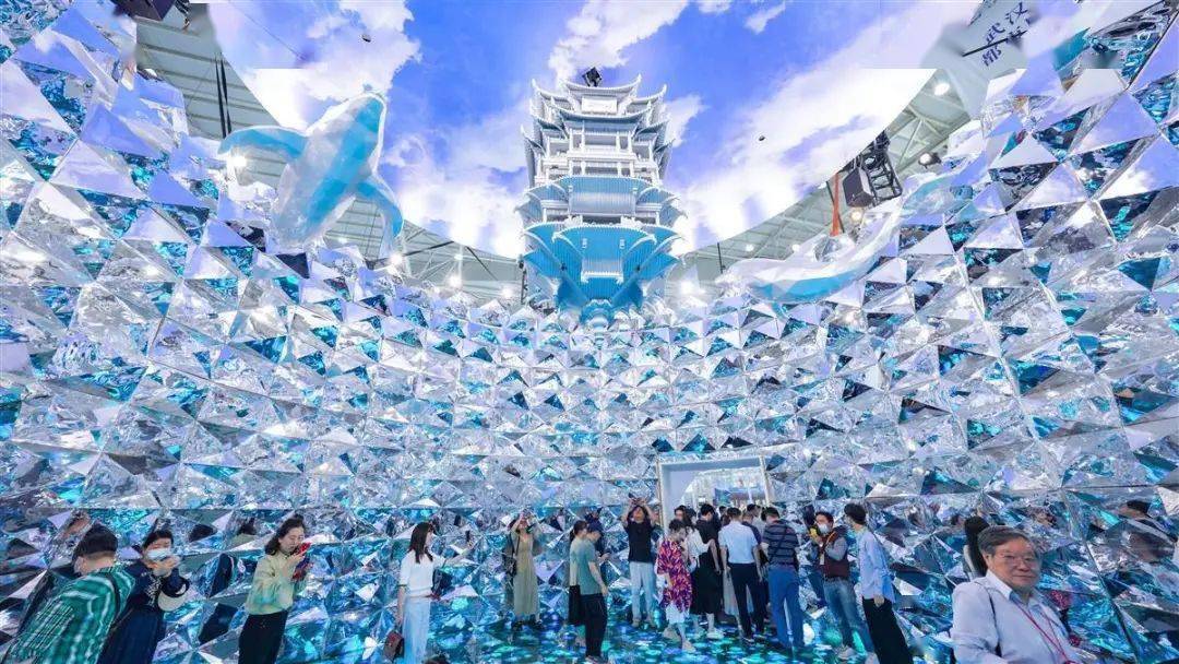 一座银色的黄鹤楼悬浮在半空,四周是光影流动的万花筒装置,梦幻迷人。这是武汉馆的第二空间,未来科幻的“无限之镜”。它藏在展馆中央,空间设计上兼具艺术审美需求与城市设计的先锋性。