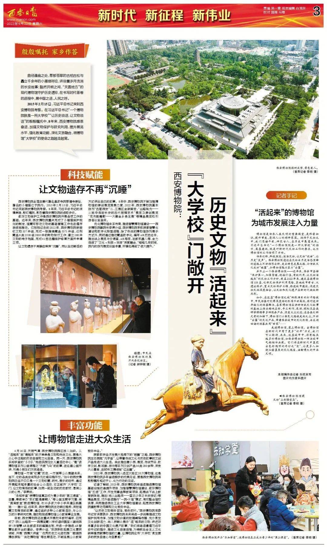 优化博物馆体系布局,推进智慧博物馆建设——西安博物院副院长李燕介绍,西安博物院积极探索智慧化建设和数字化转型进程,除了传统的博物馆陈列展示方式外,同时通过 推动藏品数字化,编写AR历史绘本,推出线上展览与云课堂,AR导览、社教机器人等,全力促进了“文化+科技+旅游”深度融合,“短短几年时间,院内的陈列展览日益丰富,环境也得到了很大提升。”