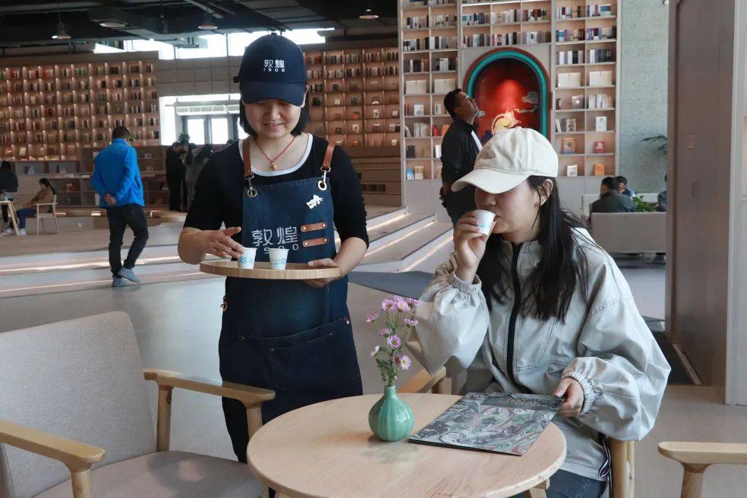游客纷至沓来,景区运行秩序井然,游客在有序购票后,在工作人员指引下乘坐观光车前往核心景区。当天,游客在甘味农产品国际展销中心、文创文化休闲区域停留,深度体验、感知敦煌文化。游客在这里打卡拍照,阅读分享,选购心仪的敦煌书籍、文化创意产品、品尝1900咖啡,乐享敦煌文化。