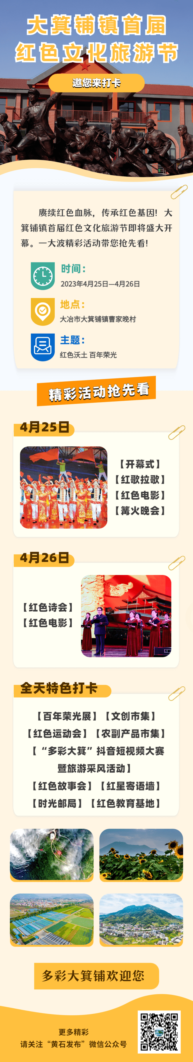 亮点:此次开幕式以红色为基调,将鲜明的红色文化融入到演出节目中,展现红色历史的厚重感。同时,还将现场发布“大箕铺镇精品旅游路线”。