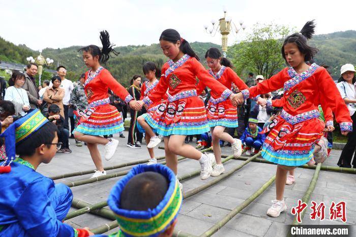 图为当地畲族少年正在跳竹竿舞,吸引了许多村民和游客围观。 刘占昆 摄