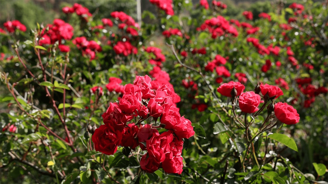 月季花,又叫“月月红”,素有“百花仙子”“花中皇后”之称,一向为文人雅士所追捧。月季山栽植的月季花品类繁多,涵盖中国红大花月季、雪山大花月季、伊丽莎白大花月季、赫尔恩大花月季等。借助梯田地势和配植的各色花草,月季山将不同的美收入“囊”中,形成了一道姹紫嫣红的靓丽风景线。