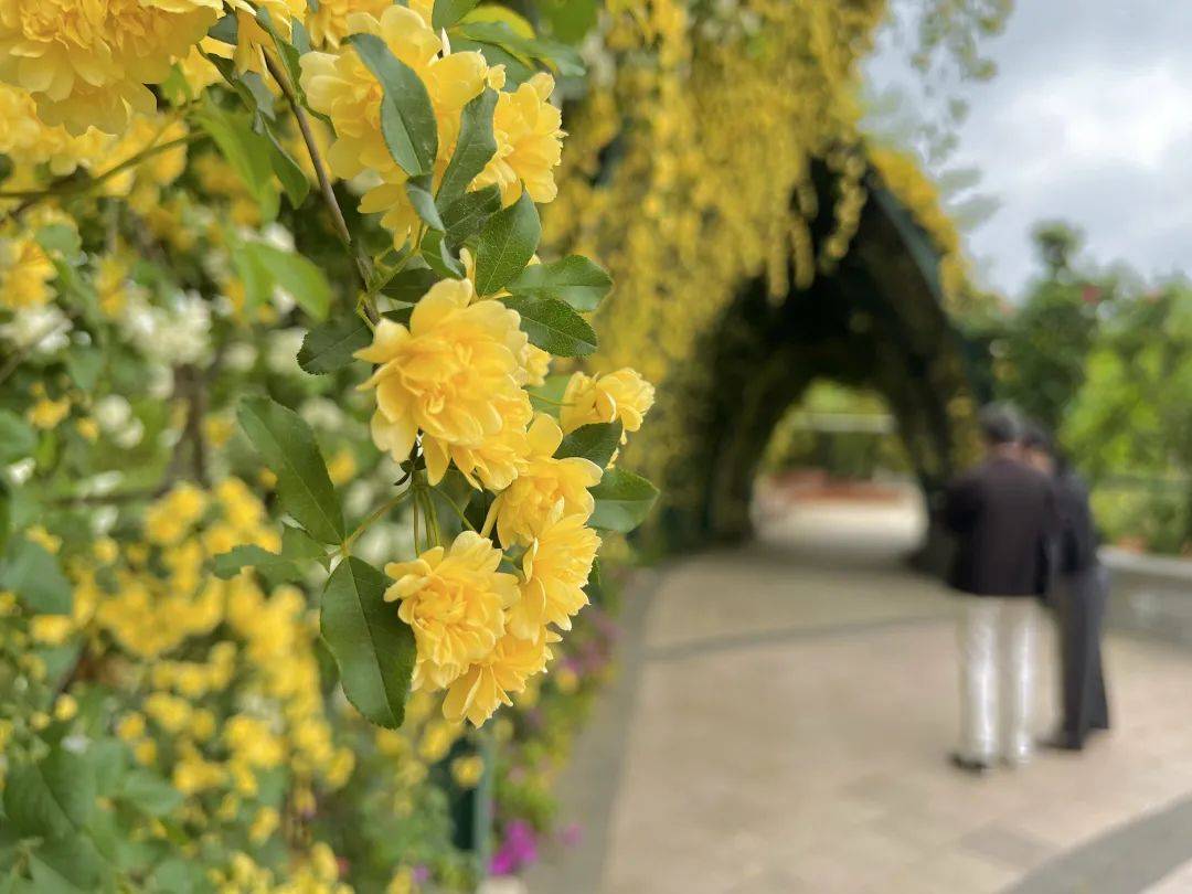 木香是顾村公园近年来新种植的月季品种,如今月季园里800米的木香回廊已铺满了木香花。这几天,木香花盛放进入了最佳观赏期。垂下的整片“花海”成了园内最美的打卡背景。“很浪漫,拍照很好看、很上镜。”