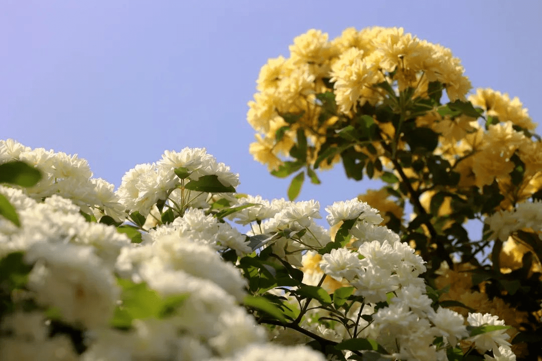 黄色的如砌金,白色的如堆雪。两种颜色的木香花从树梢一直蔓延,互相衬托,伸展着、相拥着,构成春天里一道靓丽的风景线。