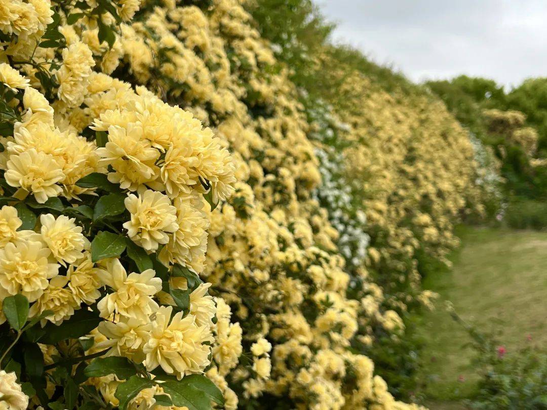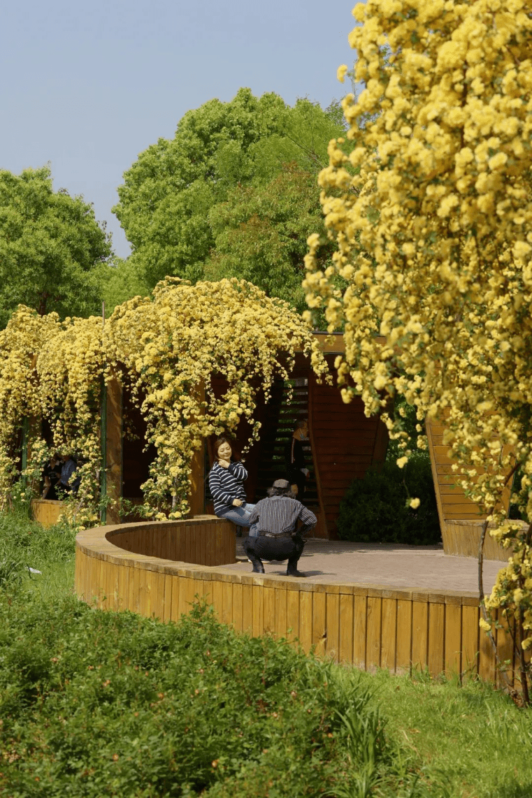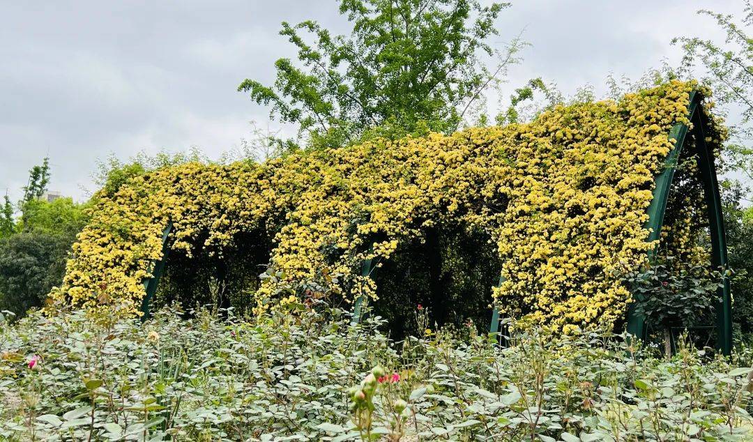 浪漫樱花谢幕,月季花接踵而至。宝山顾村公园三号门附近的月季园,此时已是芳香四溢,无数月季争相开放。其中,一种名叫“木香”的藤本月季更是花开成“海”。